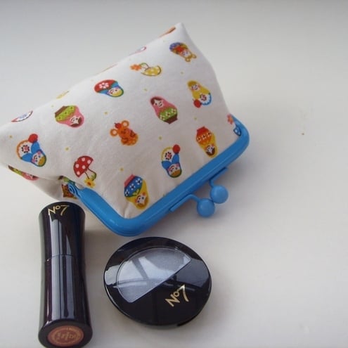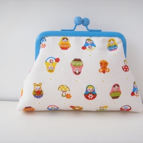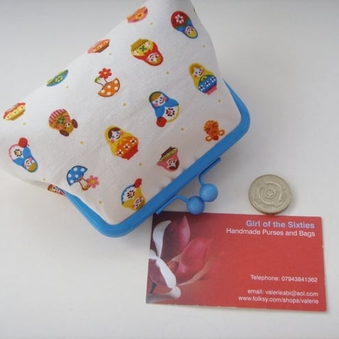 Perfect little purse for your keys, change and credit cards.Little Russian dolls fabric with contrasting lining, padding and bluel frame clasp.