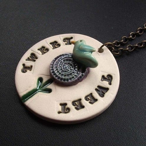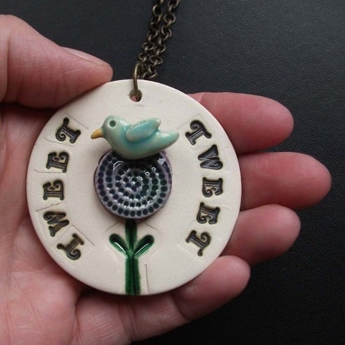 This cute little pendant is made from white earthenware clay. The bird is hand modelled and sits on a swirly purple flower.
