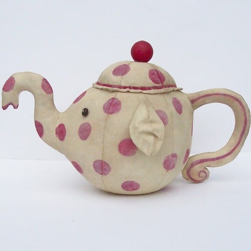 Teapot is made from linen that has been painted with creamy coloured acrylic paint. I then potato printed on the spots and then gave the whole lot a bit of a sand and sloshed on lots of coffee.When dry, I then I re-coated it with more cream acrylic paint and gave the spots another watery coat of crimson paint. The knob is papier mache and the eyes are grey mother of pearl, vintage, boot buttons and I had more fun than an elephant in a cake shop!