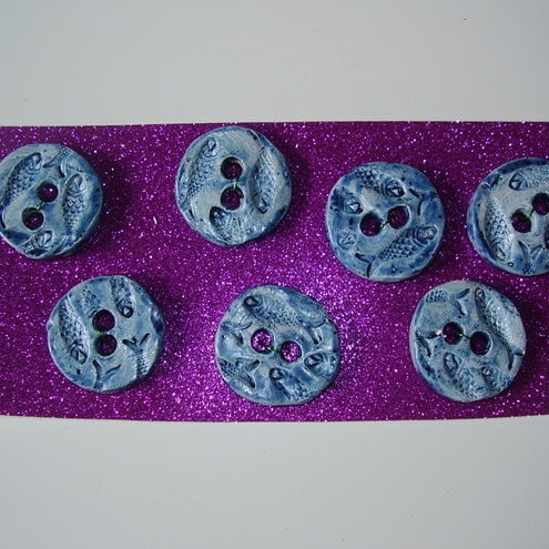 Well look no further get em while you can!! These buttons are a rich blue with textures of little swimming fish.