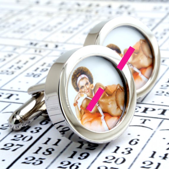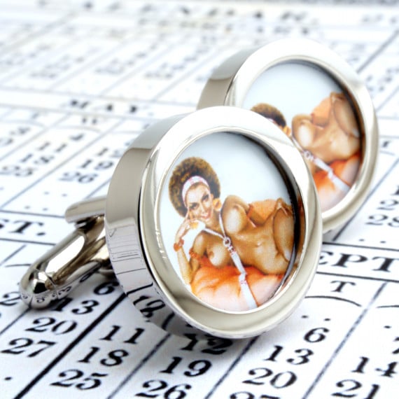 Erotic nude cufflinks with an image from a vintage pin up calendar. Lots of fun and guaranteed to get a smile.