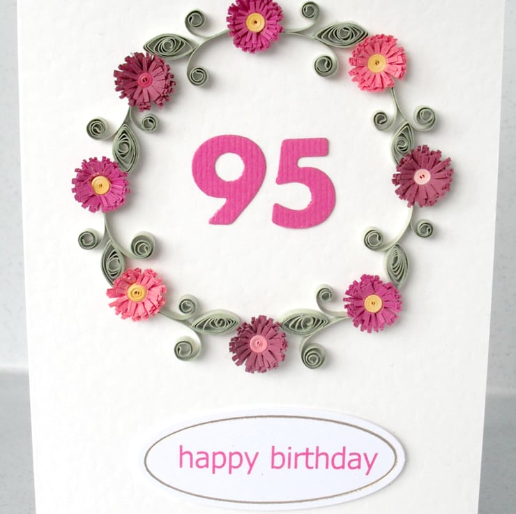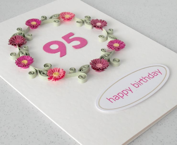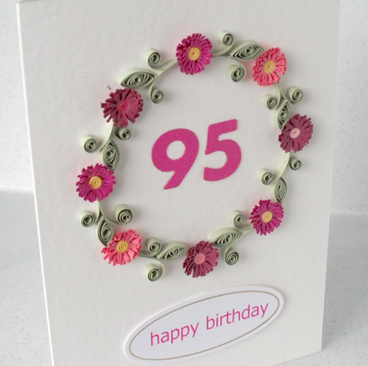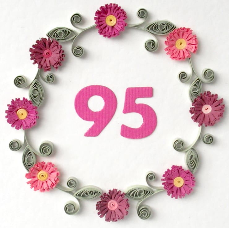 A handmade 95th birthday card with paper quilling, which can be customised for any milestone birthday.