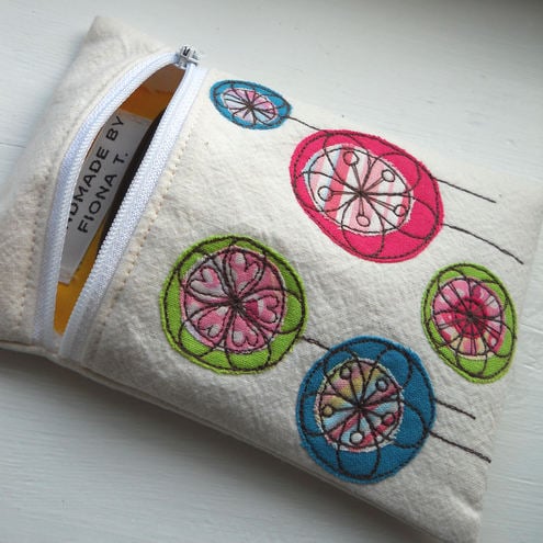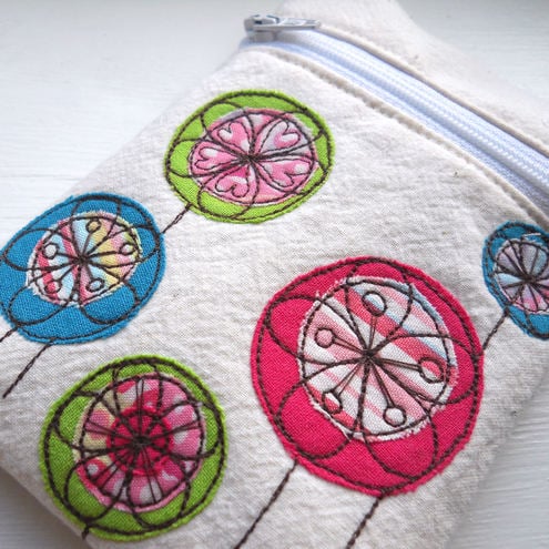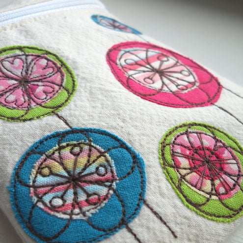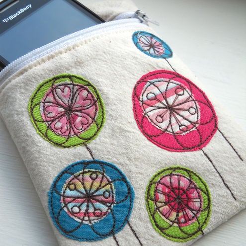 this bright, appliqued and free motion embroidered gadget case is suitable for smart phones, cameras, ipods etc, but would be equally useful as a little purse to store the bits and bobs that get lost in the bottom of your handbag