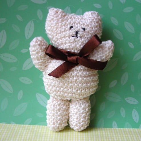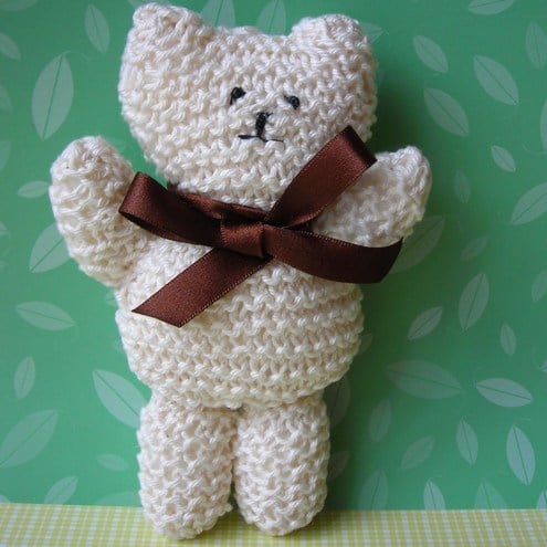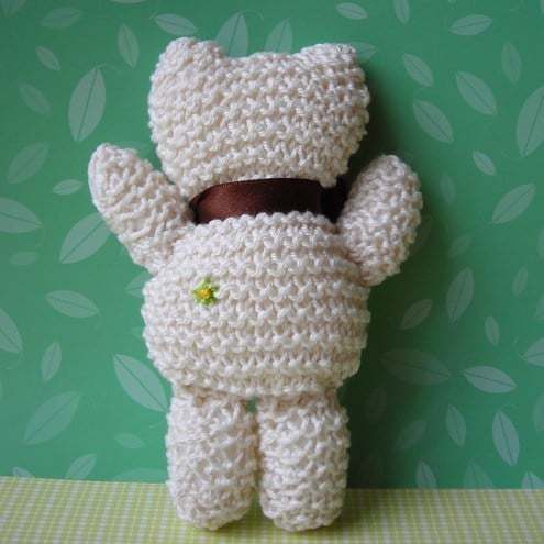 Hand knitted in Natural colour 100% cotton, with hand stitched face, and finished off with a brown ribbon bow. Stuffed with supersoft polyester toy filling.