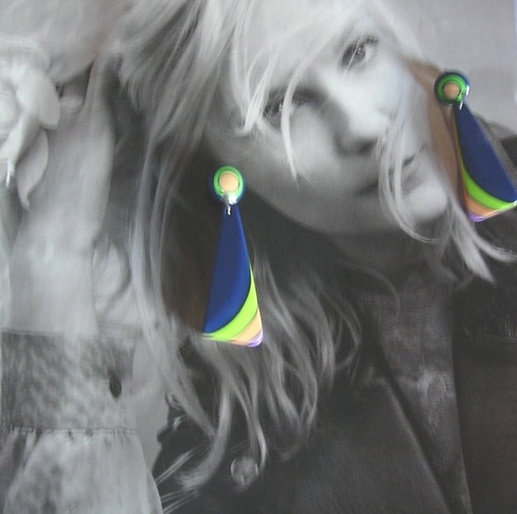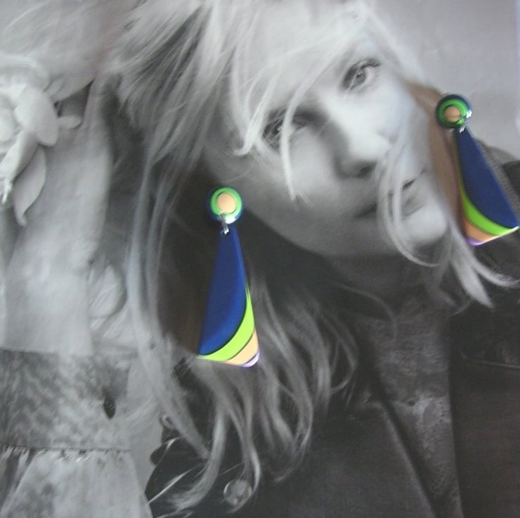 I have made these fun little 60's inspired earrings. They are blue elongated triangular shaped drops with a circular ear stud for pierced ears.