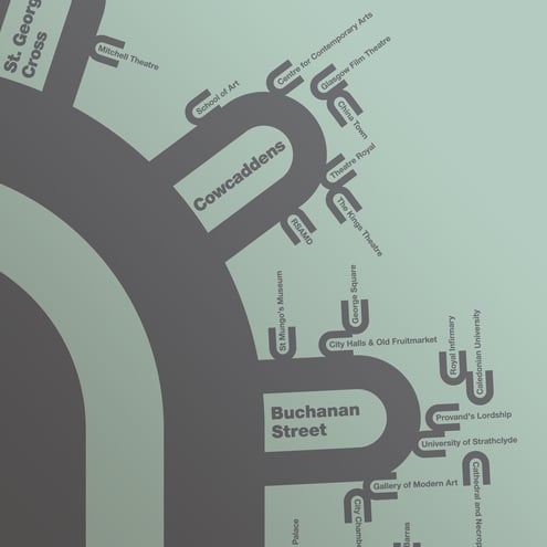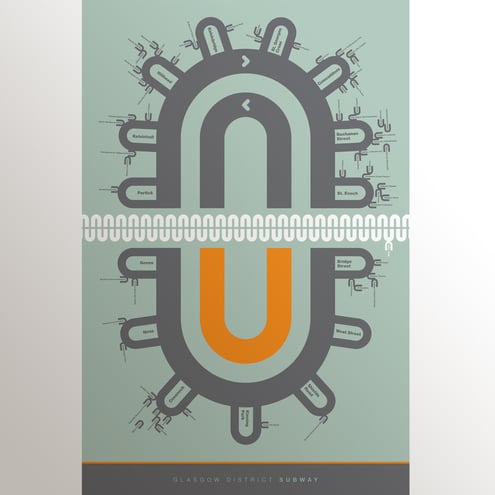 Glasgow's unique underground system in graphic form showing all 15 stations including some well known places of interest, close by. Not forgetting the River Clyde which runs between and alongside this famous transport system.