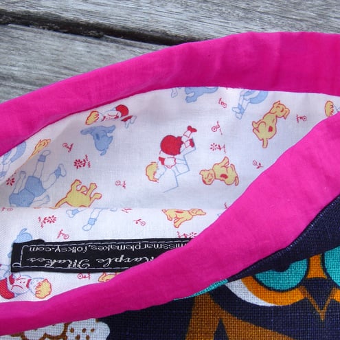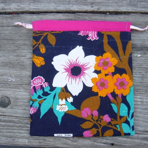 Unique little cotton drawstring bag in 70 s tea towel material with owls and flowers.Lined with a retro style cotton and bearing 2 lovely vintage buttons in same colour scheme.