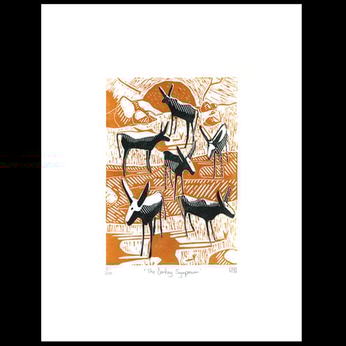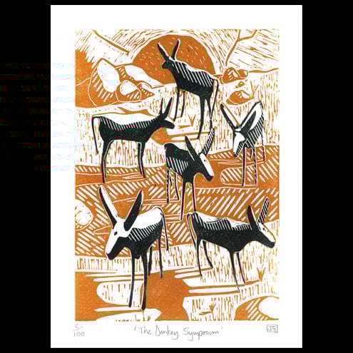 A 2-colour linocut print entitled 'The Donkey Symposium'.