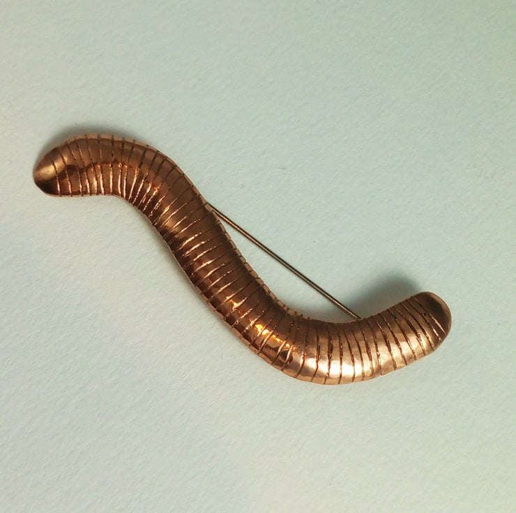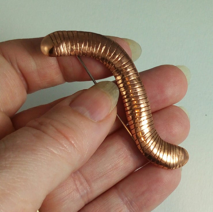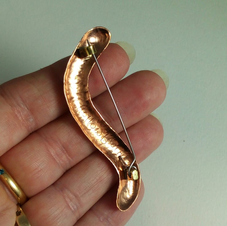 I have made this from sheet copper it has been etched and hammered to shape. The back is lacquered and the brooch pin is surgical steel.