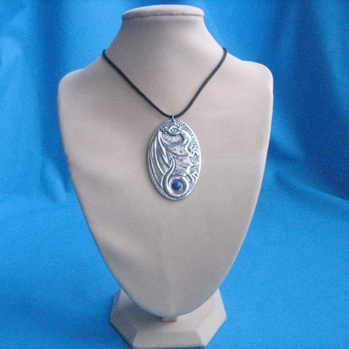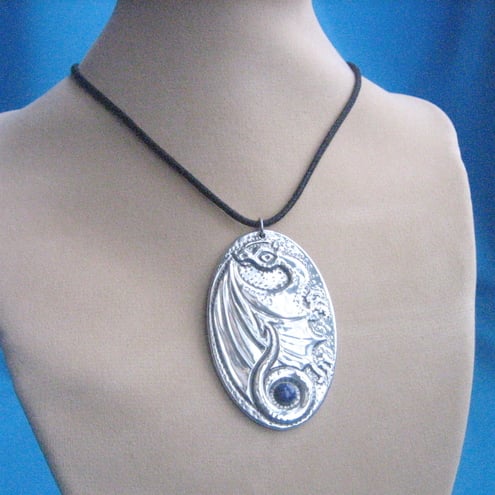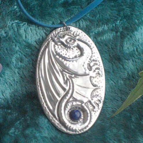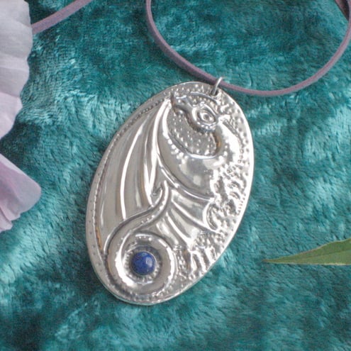 This pendant has been hand-made in shiny modern pewter, and features a beautiful genuine lapis lazuli stone. Measuring 60 x37mm, it is supplied with a lace of your choice:- round black fabric, or flat suede effect in blue,green or mauve. If you do not express a preference, I will send the black.Please note that the display model is smaller than lifesize.
