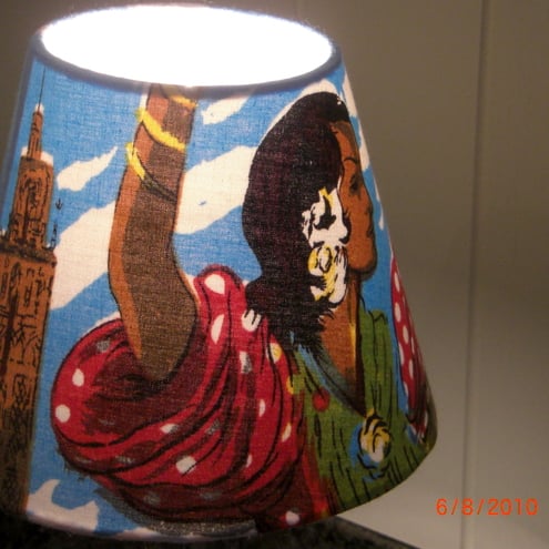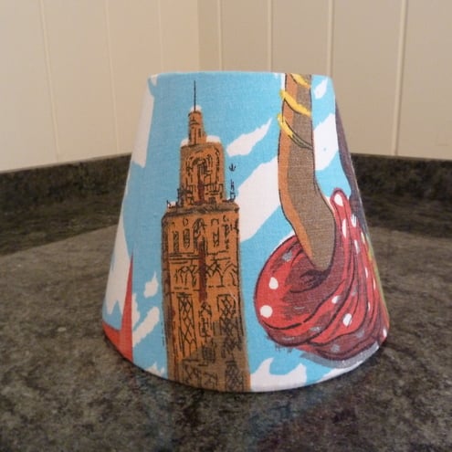 The cotton fabric shows two Spanish dancers in flamenco costumes against an inviting blue and white sky and it looks very much like the famous Giralda Tower in Seville in the background!