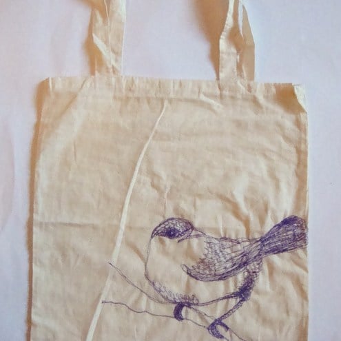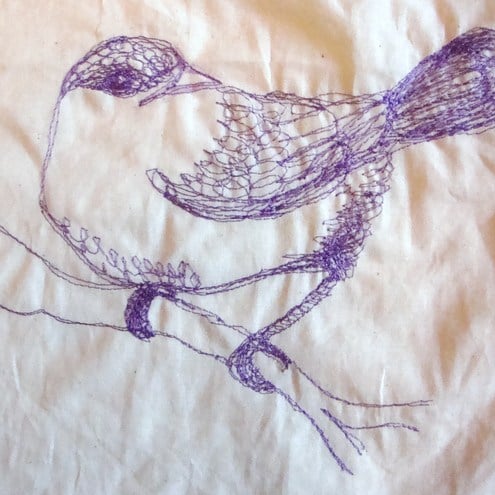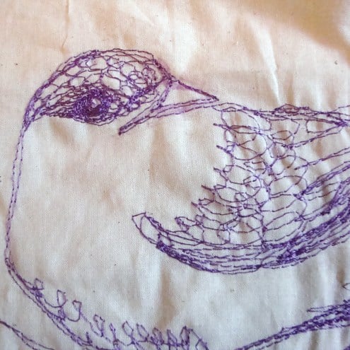 A beautiful machine embroidered bird adorns this plain calico bag. I love birds and I find that using free motion embroidery to draw them helps capture that flighty, inquisitive air that they have. This little guy is all done in purple, perching on a little branch.