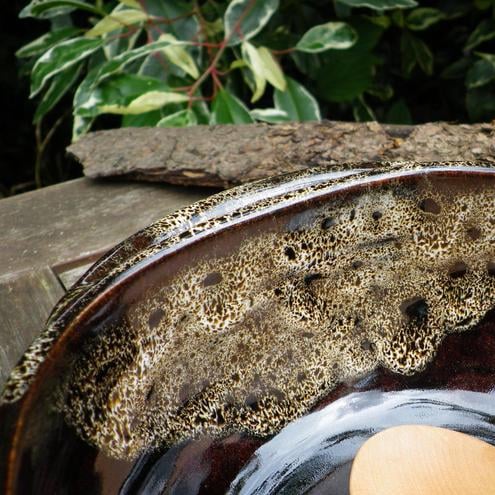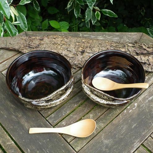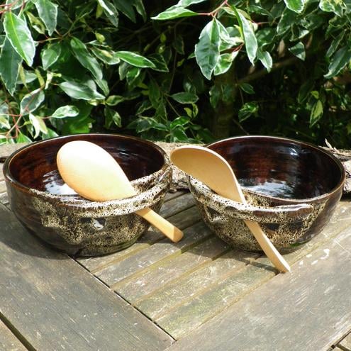 I have finished them in a traditional nutty brown japanese tenmoku glaze with a contrasting glaze drizzled over one side giving an interesting reaction.
