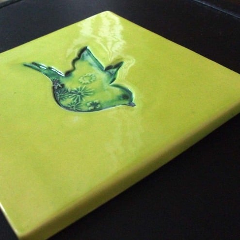 This summery green ceramic tile is made from white earthenware clay and stamped with a bird motif.