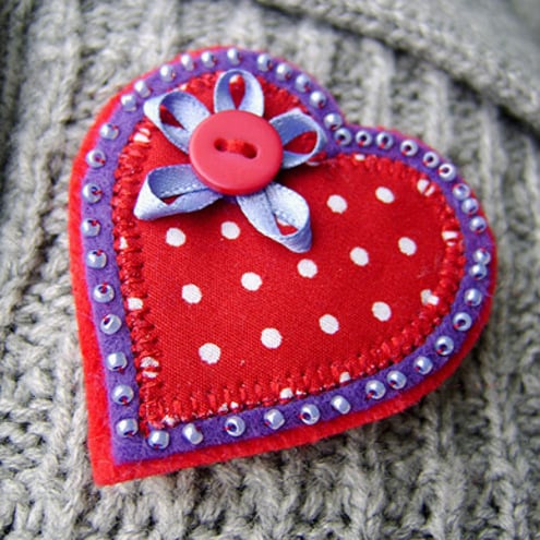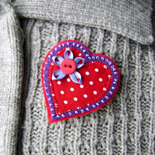 This is a lovely handmade heart brooch. The red polka dot heart is mounted onto purple and red felt. It is beautifully beaded around the edge and is finished with a pretty ribbon and button flower. It has a brooch backing for easy attachment.