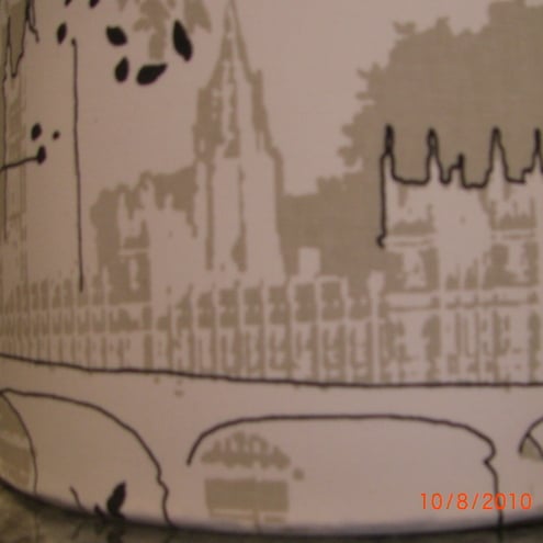 This lovely lampshade shows view of London - Big Ben, the Houses of Parliament, silver birch tree and boat on the river.