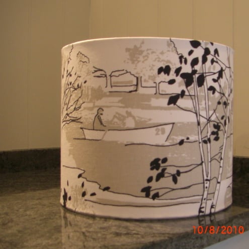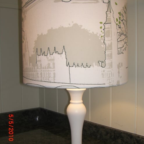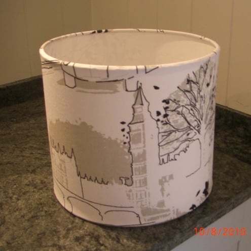 Drum lampshade covered in 'Brompton Road' linen fabric.