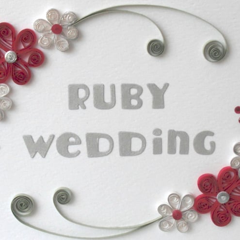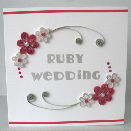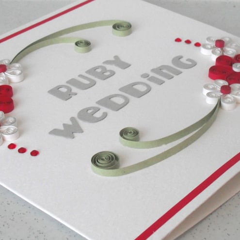 A square white textured background card featuring die cut “Ruby Wedding” message, decorated with garlands of ruby and white quilled flowers, with silver touches.
