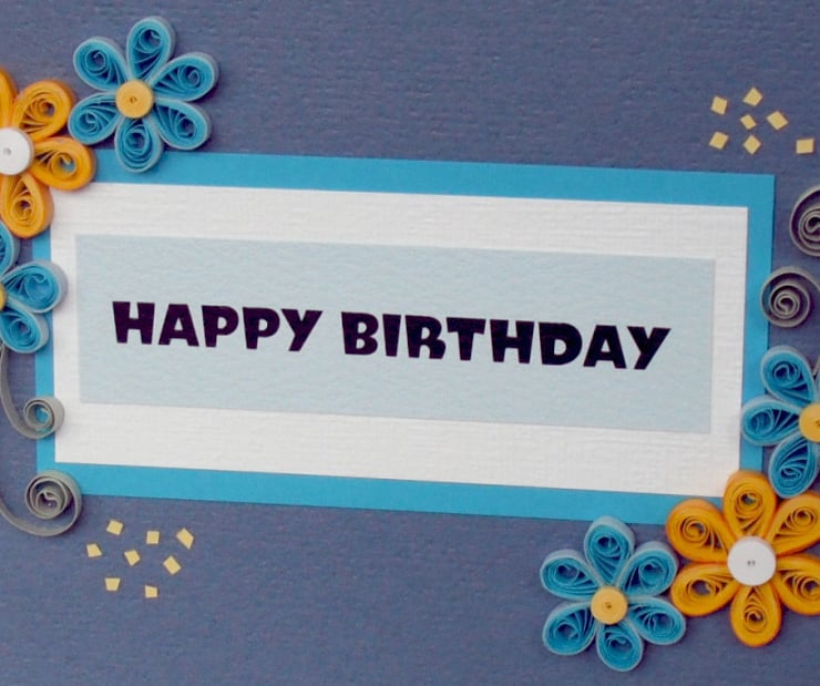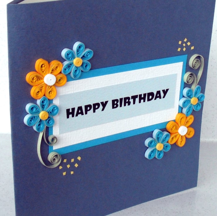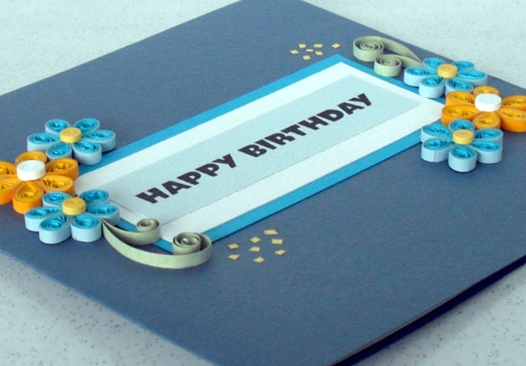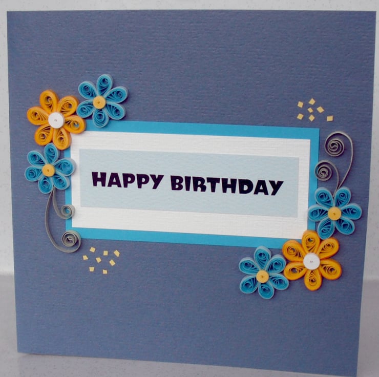 A paper quilled birthday card with paper quilling flowers in shades of turquoise and yellow - perfect for helping that someone special celebrate a birthday.