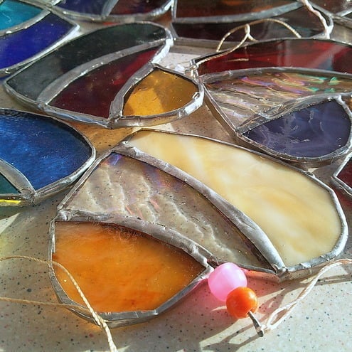 Perfect Christmas decoration or stocking filler! Each of these little hearts is unique and hung with contrasting beads and bronze thread. All made using reclaimed glass from my larger projects and made using the copper foil technique.