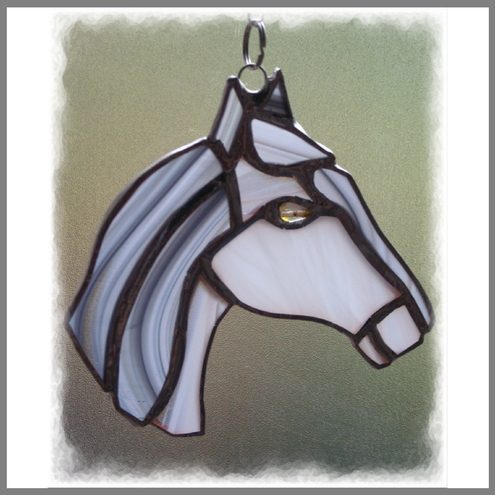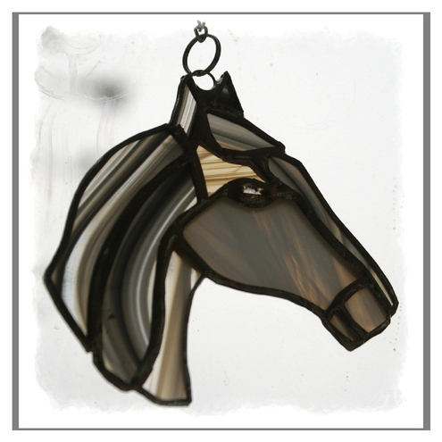 It is a horse's head in shades of streaky white glass with a mane of grey and white streaked glass.