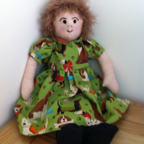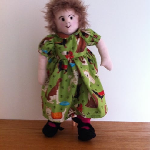 Katie is wearing a cute green dress covered in little puppies. She has red socks and pants and green ribbon in her hair.She comes in a jute carry bag decorated with her name.