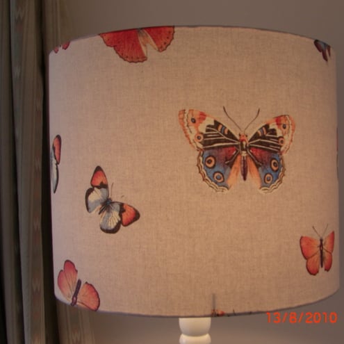 Stunning Large drum lampshade suitable for a standard lamp. This beautiful french fabric shows various butterflies in oranges, reds, blues and black on a pale fawn background.
