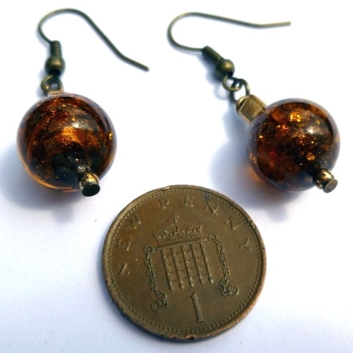 These glass bead earrings have a lovely warm glow and feature antique gold coloured metallic accent beads