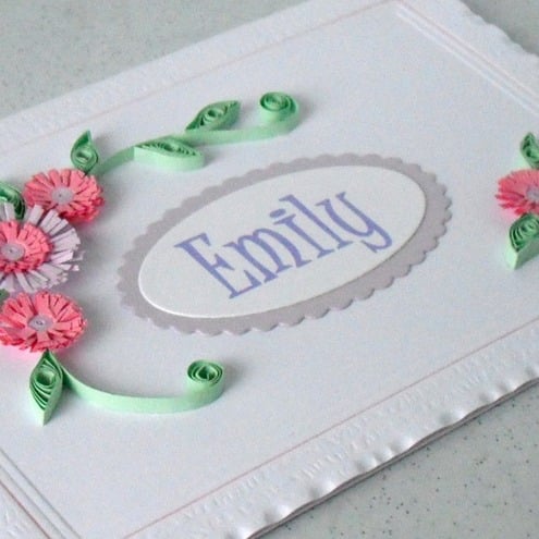 A beautiful quilled card with quilling flowers in pretty shades of pink and lilac for a very special person.