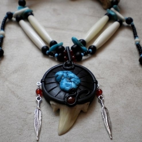 I have used an epoxy putty around the shark tooth and I have added a piece of turquoise and carnelian.
