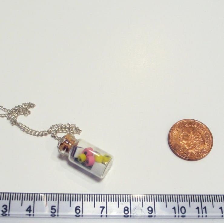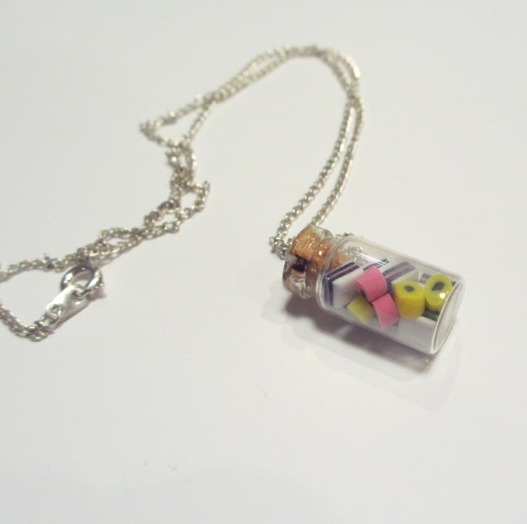 The liquorice sweets are made of polymer clay, while the jar is glass with a stopper in the top (this is sometimes cork, sometimes plastic)! Threaded onto a silver plated necklace chain.