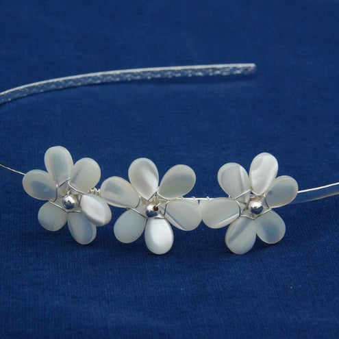 Three cute flowers made from beautiful mother of pearl beads with a silver bead in the center of each on a silver plated hair band.