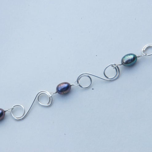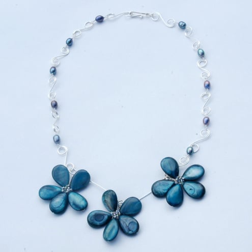 Three flowers made from a beautiful, blue coloured river shell with tiny beads in the centre, hanging on a silver plated, wirework chain with peacock colour freshwater pearls.