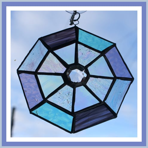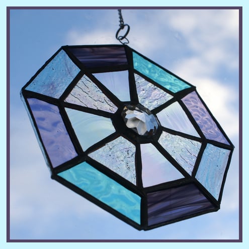 This is a stained glass suncatcher made using the Tiffany copper foil technique.