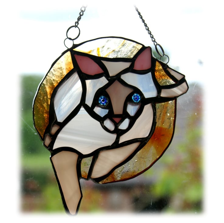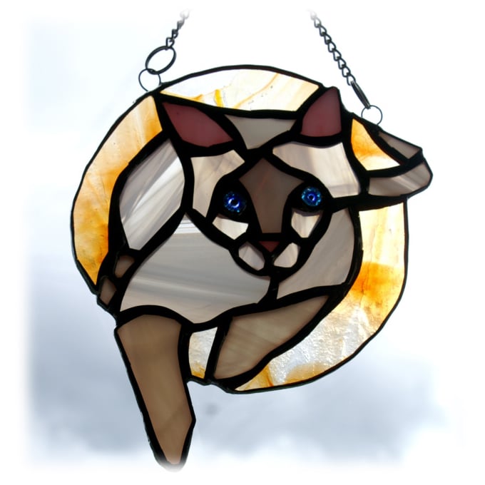 This is a stained glass suncatcher made using the Tiffany copper foil technique.