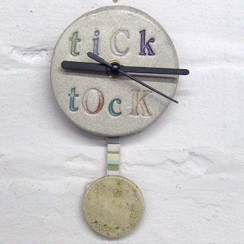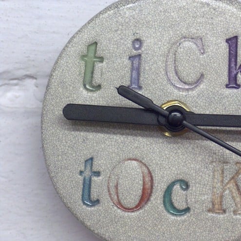 This is another one of my little pendulum clocks. The words 'Tick Tock' are embossed on the face of the clock with my vintage stamps, all in different coloured underglazes. The litle pendulum is coloured yellow with green flecks, which swings from side to side as the clock goes about it's business. The whole thing is finished in my trade mark crackle glaze.