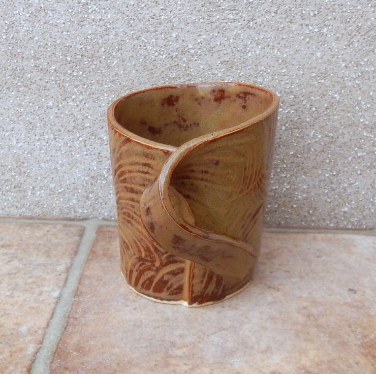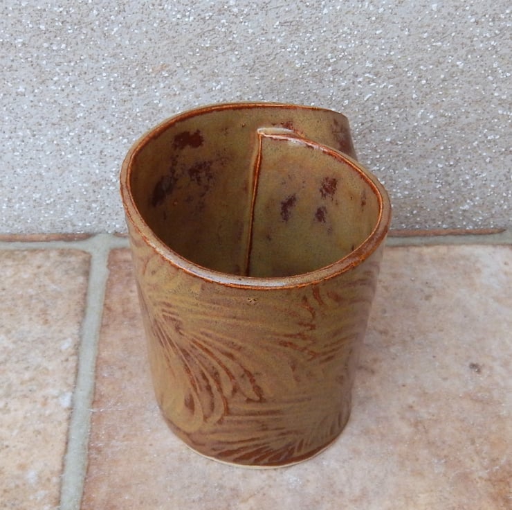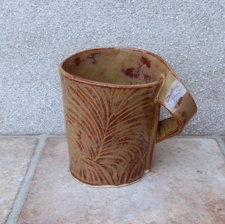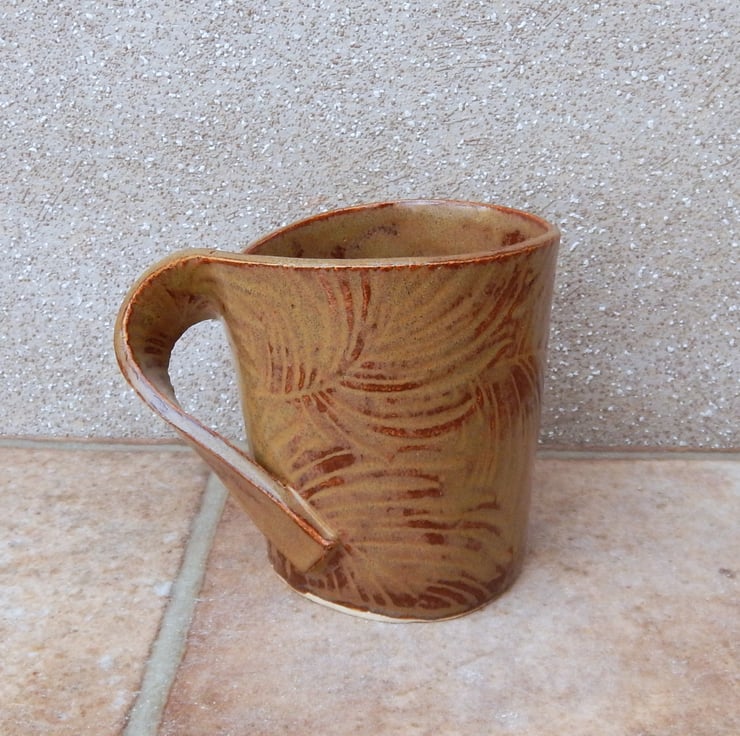 This mug was made with a rolled out piece of strong white stoneware clay which I have added a leafy texture to.
