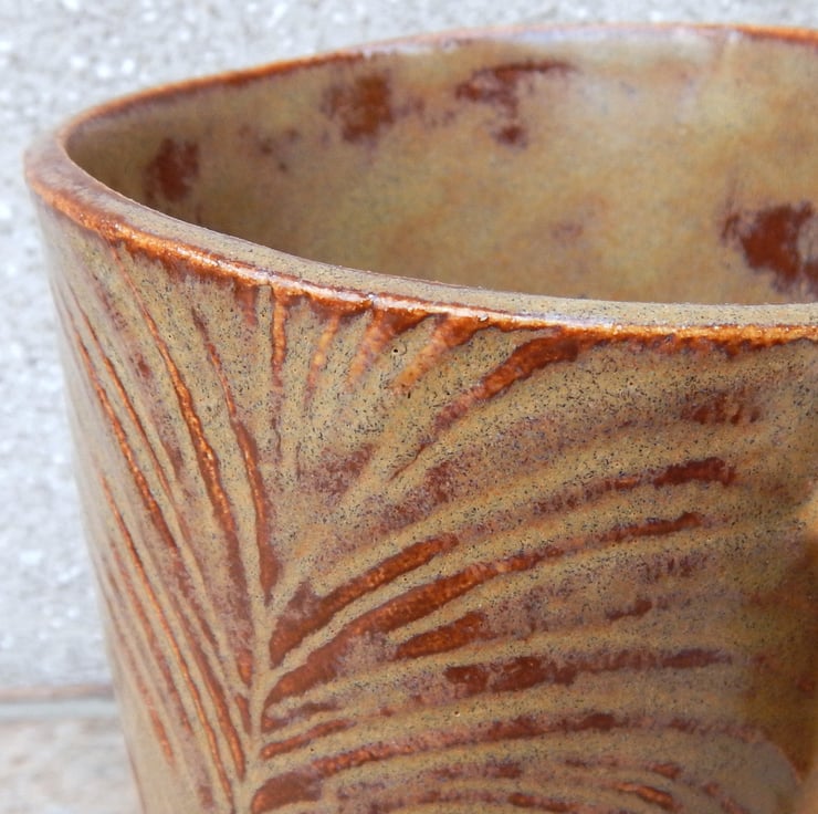 I've finished it in a lovely iron rich rust brown reactive glaze, which shows up the texture really well.