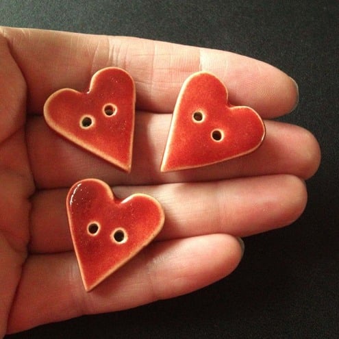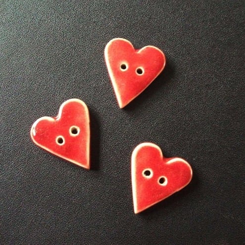 These cute red loveheart buttons are made from white earthenware clay and glazed on both sides with a lovely rich, glossy glaze and fired to 1100 degrees, so they are nice and strong.