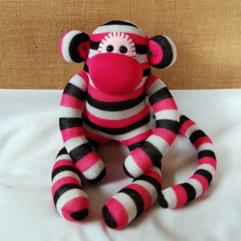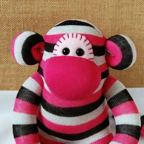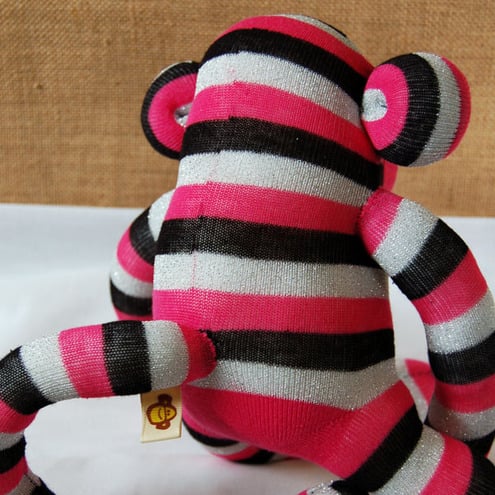 Cerise pink, black and silver white striped sock monkey featuring a baby pink felt face with cerise stitching. Approx. 34cm (13 inches).