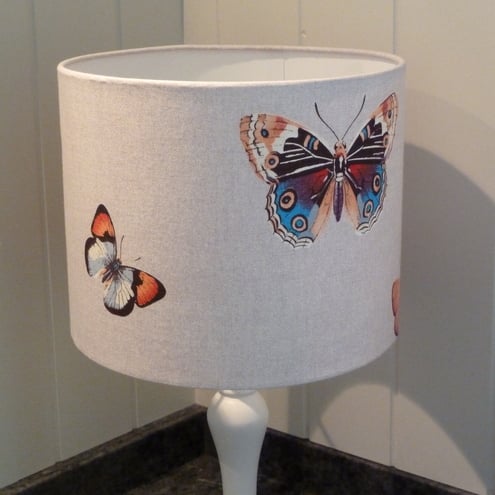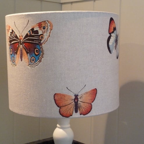 Lovely french fabric covered drum lampshade showing orange, red, blue and dark brown butterflies on a light fawn background.