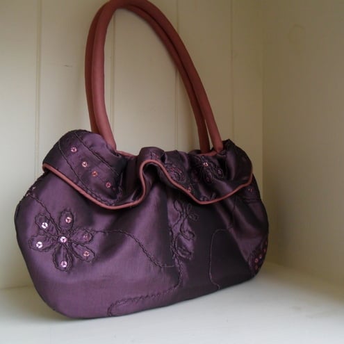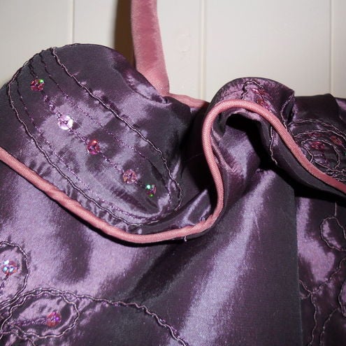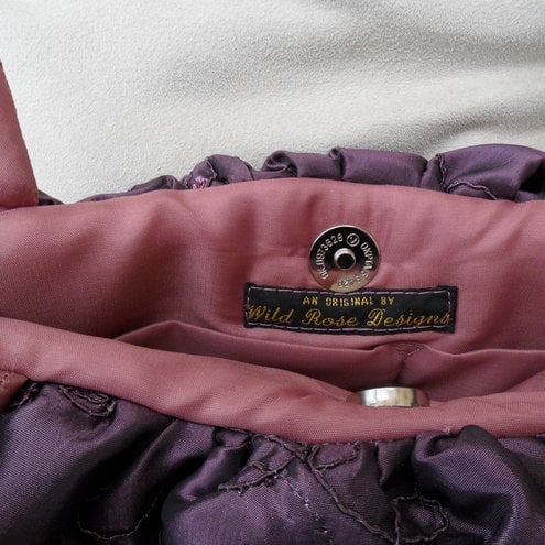 This bag is made from a dusky pink embroidered and sequined tafetta. It has a frill edged in a contrast pink piping, and the lining and handles are also in this contrasting fabric. Inside there are two pockets and the bag closes with a magnetic snap.