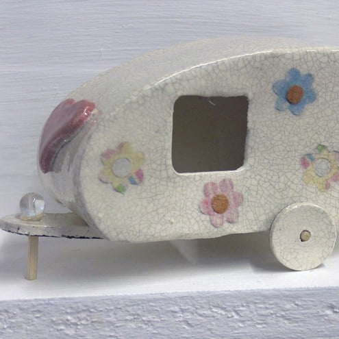 This is a handmade ceramic caravan.The side has a little window, and is decorated with flower transfers. The other side is decorated with an imprint pattern consisting of birds, sun and the moon, coloured in a grey underglaze. A red heart adorns the front, because we all love our caravans!