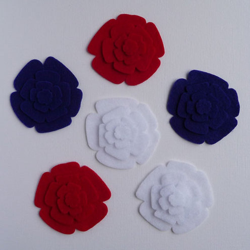 48 Felt roses, in 4 different sizes, all cut from eco-friendly, recycled craft felt. These could be used for all kinds of crafty things... Scrapbooking, collage, brooches, card making... the only limit is your imagination! This very British pack of red, white and blue flowers would be especially perfect for any Royal Wedding crafting that you might have in mind.