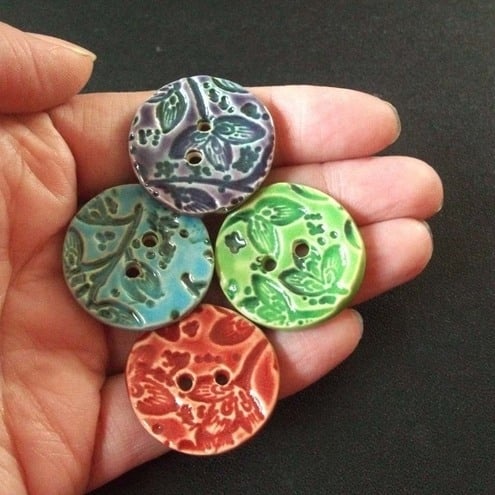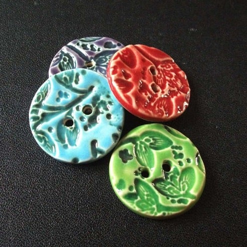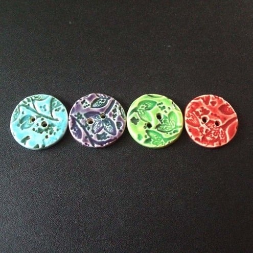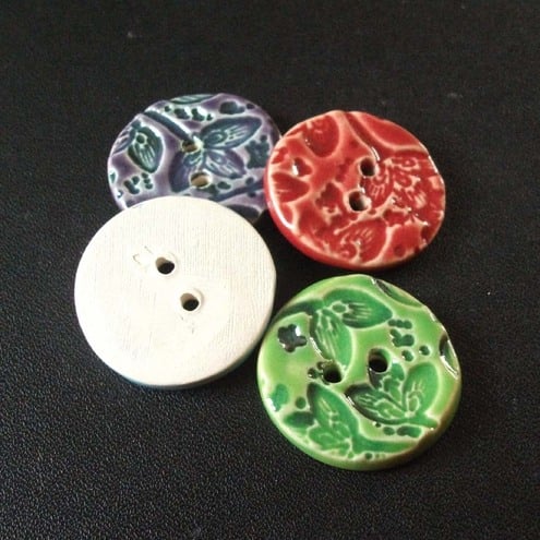 This set of four buttons are made from white earthenware clay, embossed and glazed to 1100 degrees, so nice and strong.