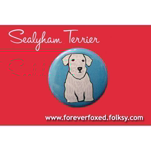Cute Sealyham Terrier on a lovely shiny badge / button with a metal pin back.