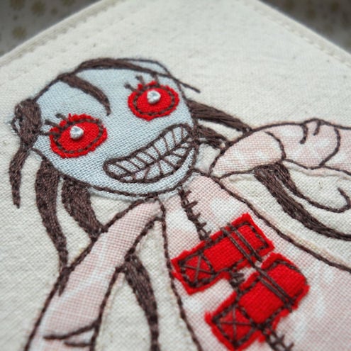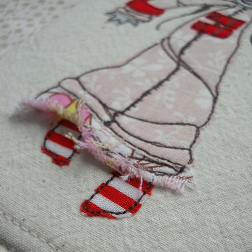 the cotton fabrics, are appliqued onto pre-washed calico, before being "drawn" on with free machine embroidery. she has hand embroidered eyeballs.