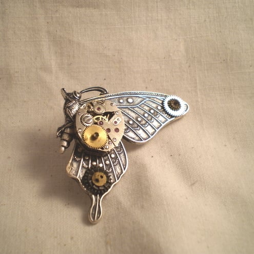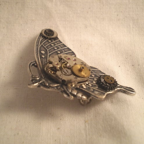 A lovely intricate antiqued silver tone butterfly base has been joined with a Vintage watch movement to create this stylish brooch... the elegant in harmony with the unusual.