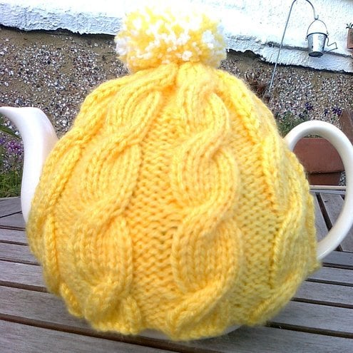This 6 cup pot bright yellow tea cosy is knitted with double strands of yarn so that it is double thick and keep your tea pot really warm. It is made of an acrylic mix yarn to make it easier to wash.