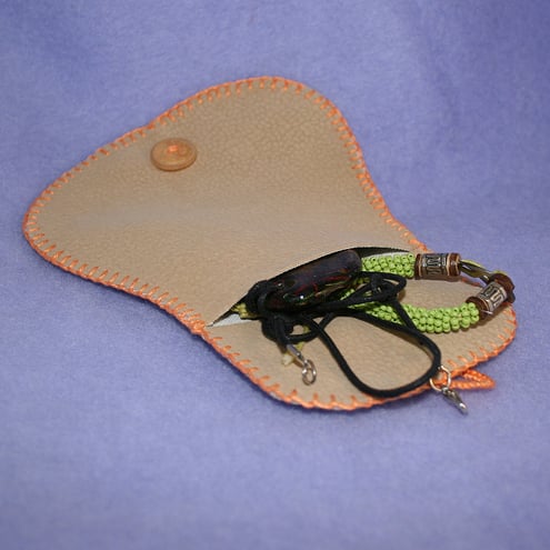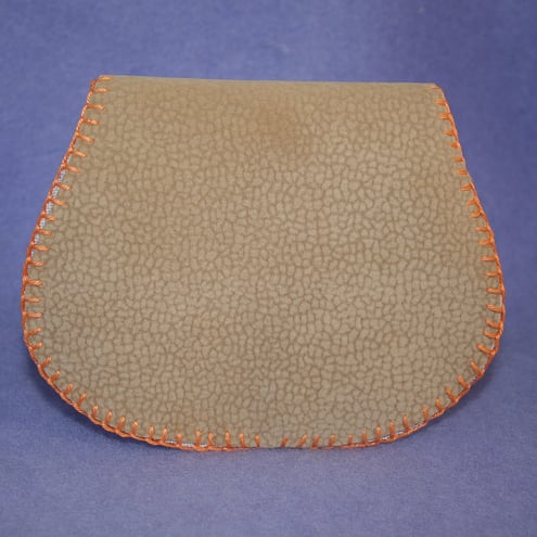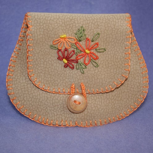 The embroidery is worked in cotton threads, using simple stitches. The body of the purse is a beige, flocked (mock suede) fabric. The purse is hand-stitched using blanket stitch and the paler orange thread. The purse closes with a stitched loop over a vintage button. The 'neck' of the purse is part way up the flap and, since it is folded over when the purse is closed, this helps to stop coins escaping.